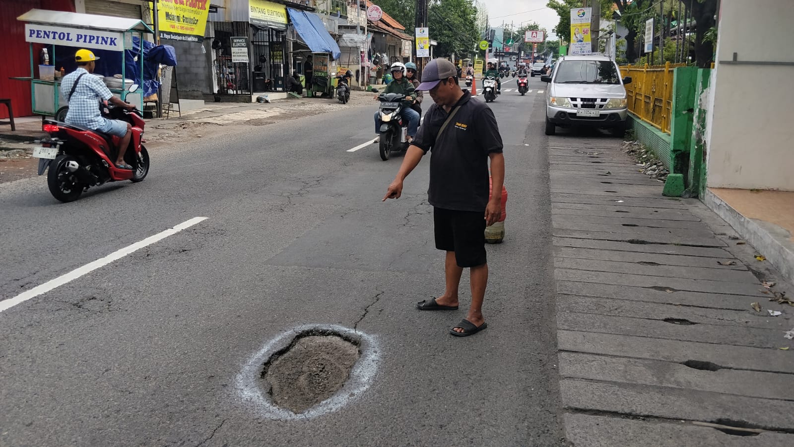 Seorang tukang parkir, Pur menjadi saksi bisu banyaknya pengendara yang terjungkal akibat kerusakan jalan yang sudah berlangsung selama dua bulan terakhir.