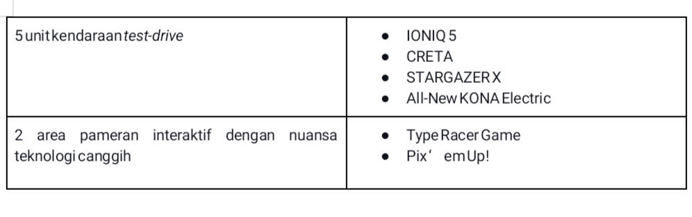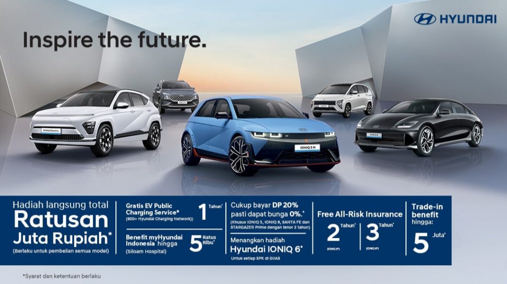 ● EV Public Charging Service 50 kwh/bulan untuk setiap pembelian EV model (IONIQ 5, IONIQ 5 N, IONQ 6 dan Kona) melalui aplikasi myHyundai Indonesia.