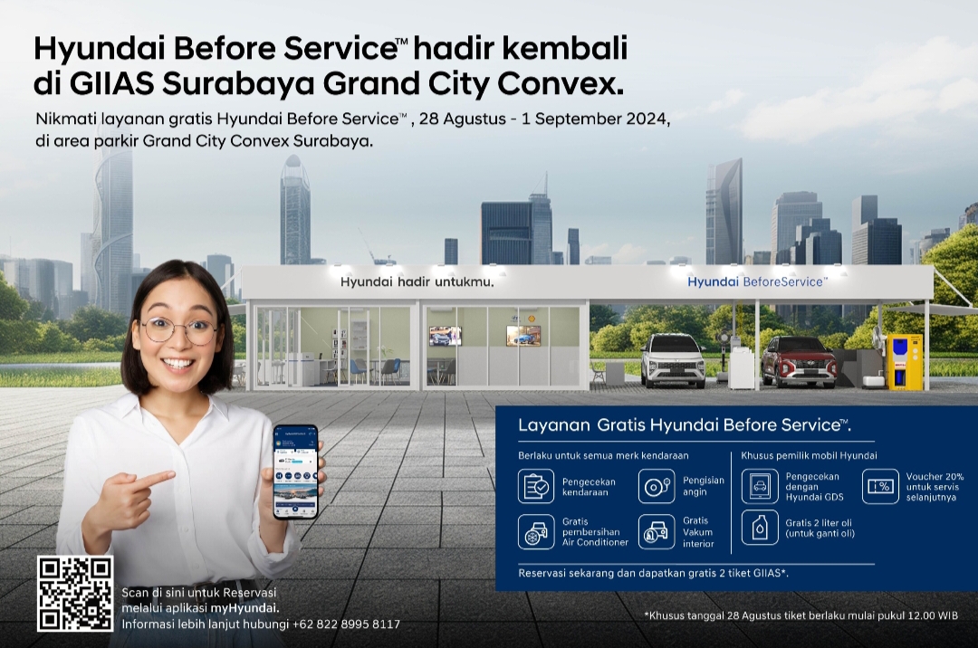 Bagi pengunjung yang ingin melakukan pengecekan kendaraan untuk mengetahui semua kebutuhan perawatan sebelum melakukan service berkala, dapat bisa langsung mendatangi Hyundai Before Service™ yang juga hadir di GIIAS Surabaya 2024. Layanan berstandar global ini bisa dinikmati pelanggan Hyundai maupun pengguna merek kendaraan lain.