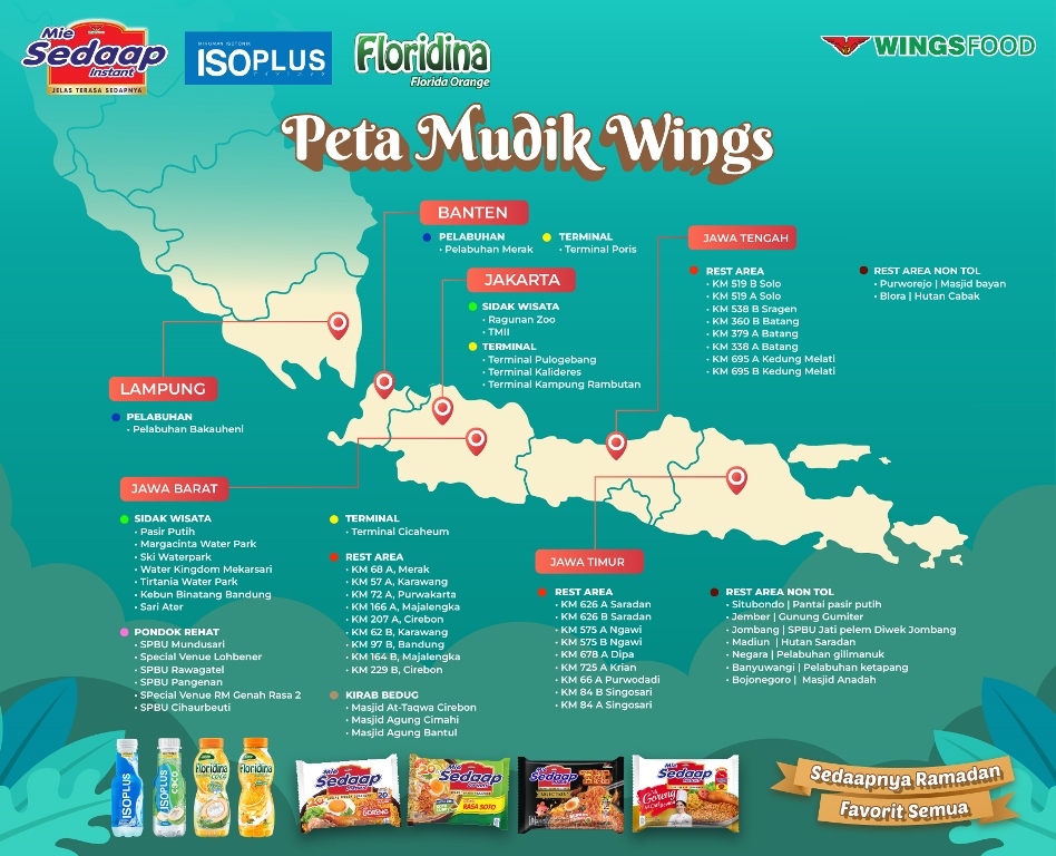 Selain fasilitas yang menambah kenyamanan, di lokasi-lokasi ini para pemudik juga dapat menikmati menu-menu makanan dan minuman dari WINGS Food yang dapat dimanfaatkan untuk sahur, takjil dan berbuka, seperti Mie Sedaap dengan topping protein, minuman isotonik ISOPLUS, air mineral AQUVIVA, Floridina dan masih banyak lagi.