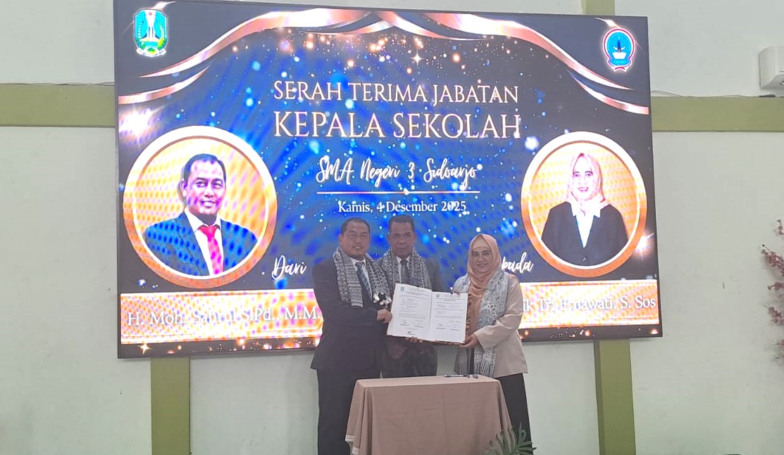 Sedangkan untuk serah terima jabatan Kepala SMA Negeri 3 Sidoarjo dari Plt Mohammad Sahrul, S.Pd MM diterimakan kepada Wiwik Tri Ernawati, S.Sos dengan disaksikan oleh Kepala Cabang Dinas Pendidikan Wilayah Sidoarjo, Dr. Kiswanto, M.Pd pada (4/12/2025) di Aula SMA Negeri 3 Sidoarjo.