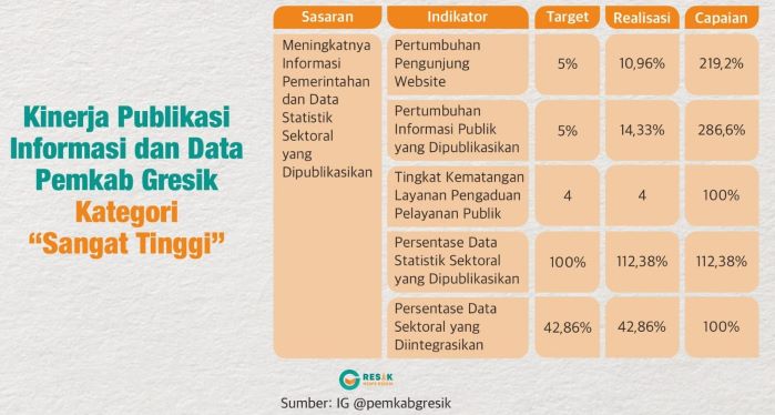 Predikat kinerja “Sangat Tinggi” juga nampak dalam hal publikasi informasi dan data yang dikelola oleh Diskominfo Gresik. Dari Laporan Kinerja Institusi Pemerintahan (LKjIP) Diskominfo Gresik tahun 2022, diketahui, bahwa pertumbuhan pengunjung website Pemkab Gresik mencapai 10,96%.