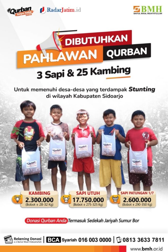 Maka Laznas BMH membutuhkan pahlawan Qurban 3 sapi dan 25 Kambing untuk memenuhi kuota khususnya Desa desa di Wilayah Kabupaten Sidoarjo yang terdampak Stunting. Paket Qurban Terbaik : Kambing 2.3Jt , Sapi patungan 2.6 Jt , Sapi Utuh 17.750Jt , Rekening Qurban : BSI 704 29 55 293 , Mandiri : 1410007554579 a/n. Baitul Maal Hidayatullah atau bisa menghubungi Customer Center BMH : +62 813-3633-7811 atau +62 812-3246-7711.