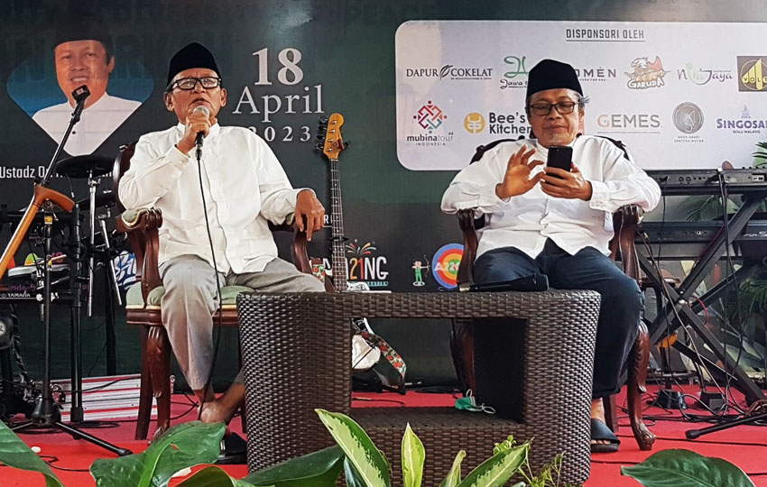 Penyair D. Zawawi Imron (kiri) bersama Dr. H. Moh. Sulthon Amien dalam acara Nabur Kurma di SD SAIM, Jl. Medokan Semampir Indah, Surabaya, kemarin.